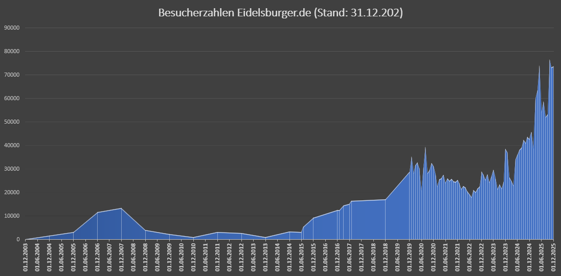 Die Besucherzahlen auf Eidelsburger.de sind im Jahr 2025 wieder beeindruckend angestiegen. Im Vergleich zu 2024 konnten wir einen deutlichen Zuwachs verzeichnen, was mich unglaublich freut und motiviert. Während wir 2024 noch 428.751 Besucher begrüßen durften, waren es 2025 bereits 723.557 Besucher! Das ist ein Wachstum von satten 68,76 % im Vergleich zum Vorjahr!
